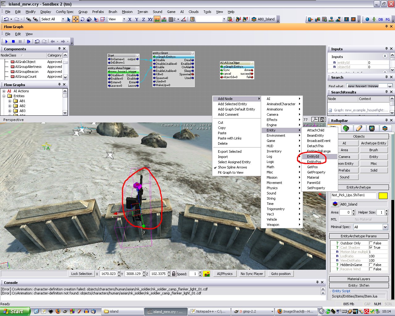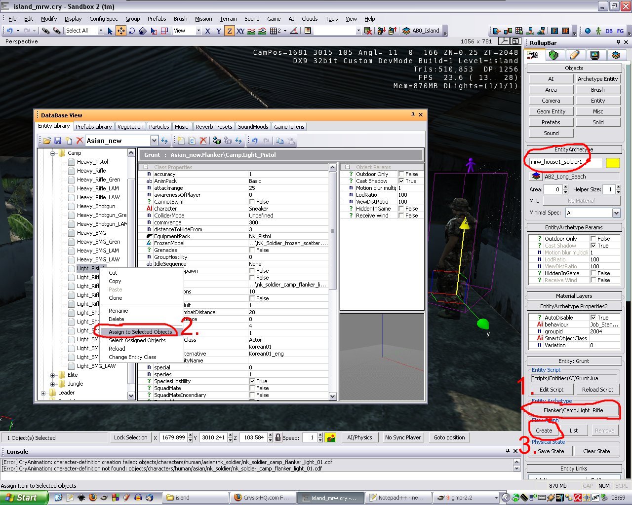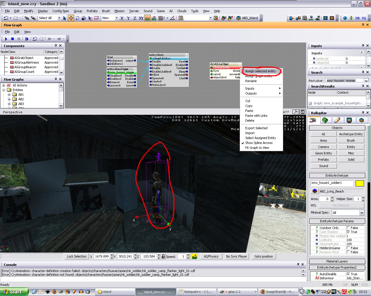 Dann habe ich einen Gegner ins Level gesetzt (bzw. einen bestehenden kopiert, erschien mir einfacher & sicherer), ihm eine andere Waffe in die Hand gedrückt (siehe Bild), ihn umbenannt (mrw_ ist mein Kürzel, so weiß ich, was von mir ist) und dann einen [Flow Graph] für ihn erstellt.
