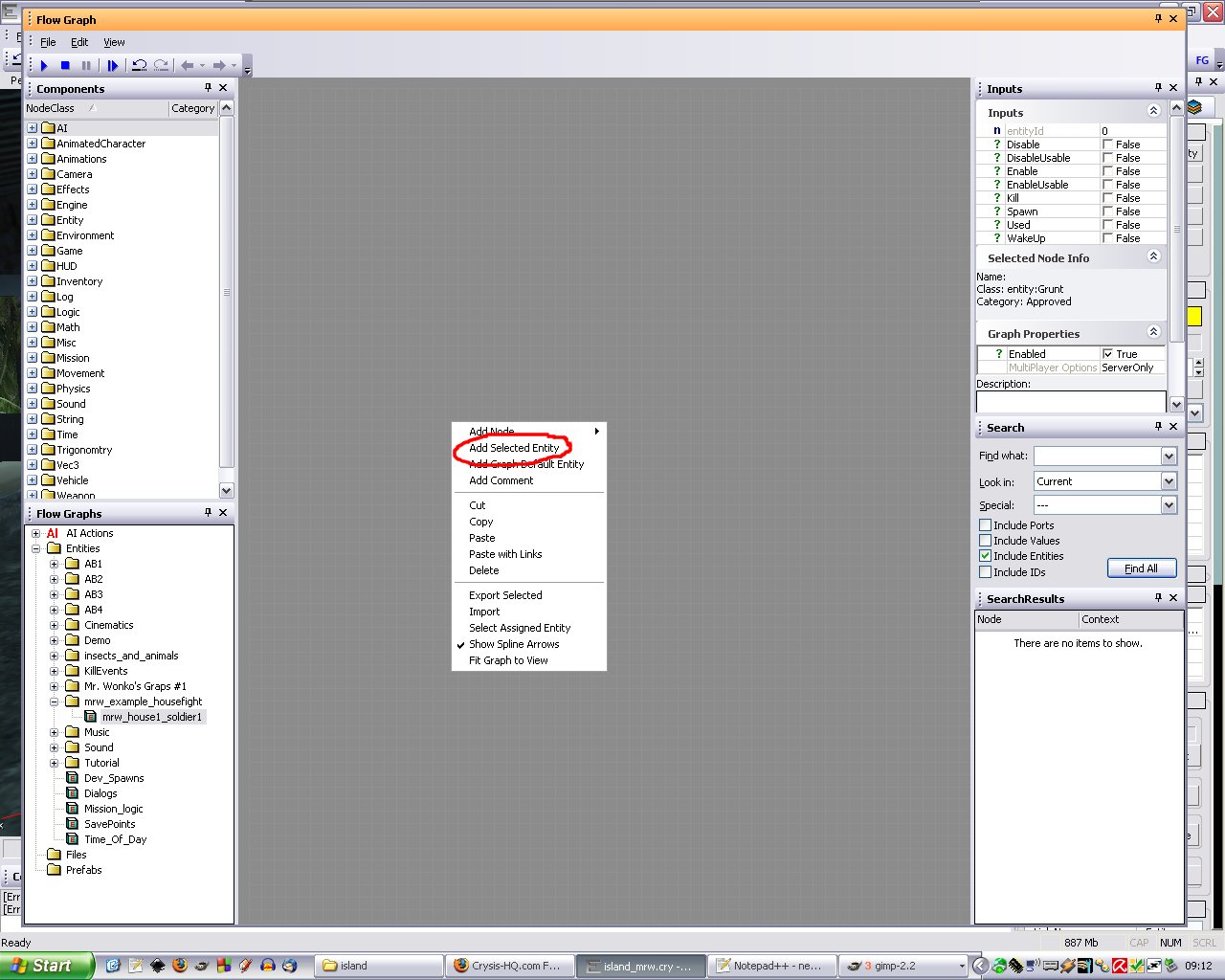 Nun werdet ihr gefragt, in welche Gruppe der [Flow Graph] soll, ich empfehle euch, eine neue Gruppe zu erstellen. Also unten auf New und einen Namen eingeben. Jetzt habt ihr den "Flow Graph Editor" vor euch, noch ziemlich leer das Teil. Wir ändern das: Rechtsklick auf das Fenster mit dem Gitter und [Add Selected Entity].