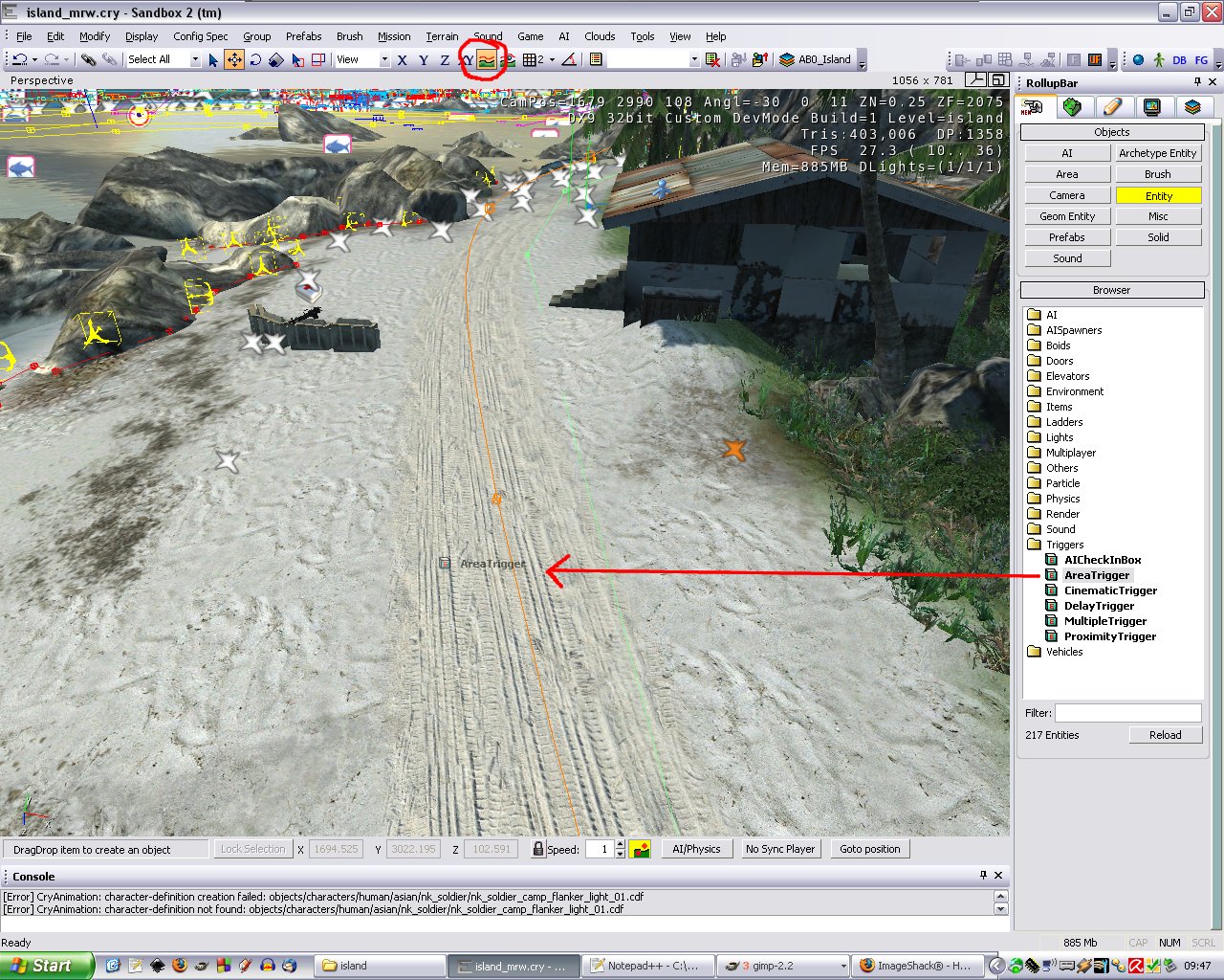 Sucht euch also unter [Entity] -> [Trigger] den [AreaTrigger] heraus und zieht in auf die Map. Achtet darauf, dass ihr [Align to Terrain] aktiviert habt, sonst landet der Trigger ganz leicht unter der Erde und ihr findet ihn nicht wieder.
