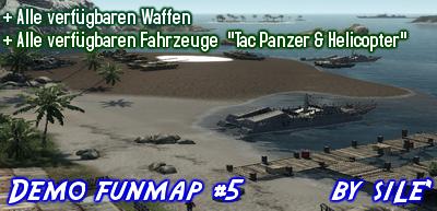 Der Unterschied zur "SP-Demo Map # 4 by Sile" ist, dass es in dieser Version eine extra Insel mit allen verfuegbaren Waffen und Fahrzeugen gibt. Sonst hat sie alle Features der #4'er Version.