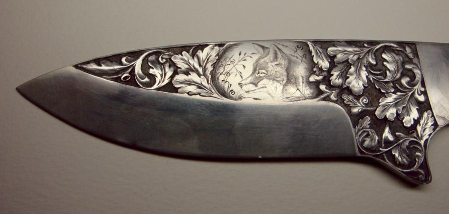 Ich habe mal wieder was graviert. Diesmal ein Messer (rohling) für meinen Vater. Das Eichenlaub ist komplett modelliert. Der Verlauf sieht sicher nicht natürlich aus, ich wollte es mehr als geschwungenes Ornament.