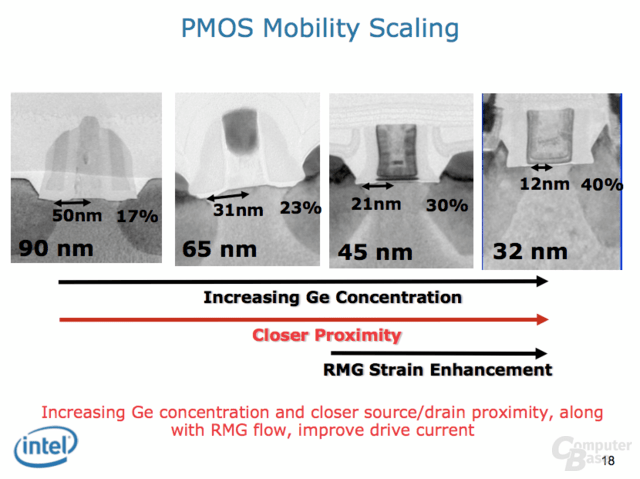 Die 32-nm-Fertigung basiert bei Intel auf der zweiten Generation der „High-K Metal Gate“-Technologie. In kritischen Bereichen wird zudem erstmals die Immersionslithografie eingesetzt. Mit vielen technischen Tricks und diversen Metallen wie Aluminium, aber vor allem auch Germanium, werden sehr kleine Strukturen gefertigt. Dies alles geschieht weiterhin mit der 193-nm-Lichtquelle, die laut Intel auch bei kommenden CPUs mit lediglich 16 nm im Einsatz verbleiben dürfte. Intel nutzt diese Lichtquelle seit einiger Zeit, neu ist in der 32-nm-Fertigung, dass die trockene Lithografie mit hochreiner Luft in einigen Bereichen von der flüssigen unterstützt wird, da mit ihr das Verhalten der Lichtbrechung positiv beeinflusst werden kann. Gleichzeitig wird die Konzentration von Germanium als Zusatz deutlich erhöht, was in geringere Abstände mündet (siehe Bilderstecke).