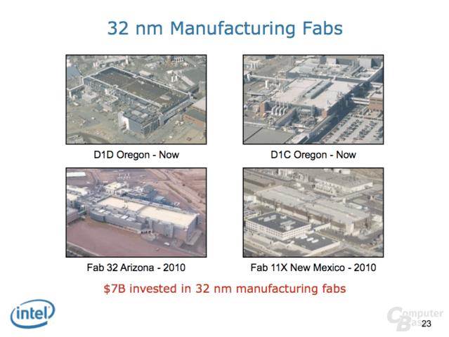 In einer der vielen Präsentationen im Laufe des Tages, bei der Pressevertreter aus ganz Europa anwesend waren, ging es um die aktuelle Massenproduktion der 32-nm-CPUs, die in Kürze im Handel erwartet werden. In zwei Werken in den USA werden aktuell 300-mm-Wafer in 32 nm gefertigt, zwei weitere Werke sollen im Jahr 2010 die Massenproduktion aufnehmen.