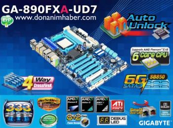 ereits vor einigen Wochen tauchten erste Details und Bilder von Gigabytes kommender High-End-Platine GA-890FXA-UD7 für AMD-Prozessoren auf. Neue Präsentationsfolien des Herstellers stellen das AM3-Mainboard und vor allem seine zahlreichen Features nun genauer vor. Das Motherboard mit AMDs Chipsatz-Flaggschiff 890FX unterstützt dabei natürlich auch die kommenden Hexa-Core-CPUs namens Phenom II X6. Es bietet ganze sechs PCI-Express-x16-Slots (2.0) von denen vier mit Radeon-Grafikkarten im 4-way-CrossFireX-Verbund bestückt werden können, die dann allerdings jeweils nur mit acht Lanes angebunden werden. Die restlichen beiden PCI-Express-Slots laufen im x4-Modus und sind für andere Erweiterungskarten gedacht. Dank der SB850 stehen sechs SATA-Ports der neuen 6Gbit/s-Generation zur Verfügung. Per Zusatzchip von NEC wird auch USB 3.0 mit bis zu 5 Gbit/s unterstützt. Weiterhin gibt es zwei kombinierte eSATA/USB-Anschlüsse, über die auch stromhungrige externe Festplatten ohne zusätzlichen Stromanschluss betrieben werden können, da sie dreimal so viel Strom liefern sollen als herkömmliche USB-Ports. Die CPU-Spannungsversorgung besteht aus einem 8+2-Phasen-Design, welches Prozessoren mit einer TDP von 140 Watt unterstützt und für ordentlich Übertaktungsspielraum sorgen soll. Durch das Feature „Precision OV“ soll sich die Spannung für CPU, Chipsatz und Speicher mittels speziellem Controller präziser einstellen und überwachen lassen. Die Spannungseinstellung soll dabei in sehr kleinen Schritten von nur 0,001 Volt möglich sein. Weiterhin gibt es Onboard-Buttons für Power, Clear CMOS und Reset sowie ein Debug-LED-Display für die Fehlersuche. Zur Freischaltung von deaktivierten Kernen bei AMD-CPUs ist das „Auto Unlock“-Feature vorgesehen, was Gigabyte auch als „Core Boost“ bezeichnet. Ein eigener Turbo-Modus, wie ASUS ihn offenbar plant, wird hierbei allerdings nicht erwähnt.